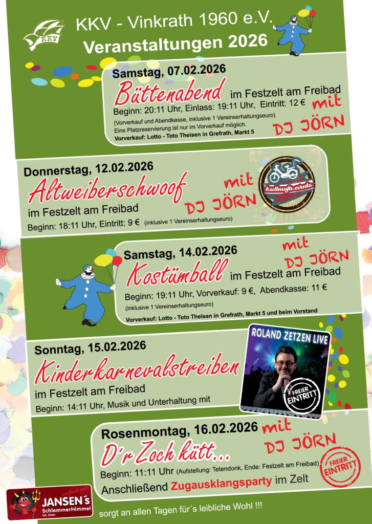 Karneval 2026 Ab sofort gibts die Karten bei:Loto TheisenMarkt 5in GrefrathIhr könnt euch auch noch für den Rosenmontagszug anmelden unter Zuganmeldung@kkv-vinkrath.de Schön, dass ihr hier seid und unsere Homepage besucht.Hier findet ihr alle wichtigen Infos rund um den Bööscher Karneval, viele Bilder in Galerien und die aktuellsten News des KKV. Du willst Mitglied beim KKV werden? Dann klick einfach hier und lade unseren Mitgliedsantrag runter.Wir freuen uns immer über alle Karnevalsjecken, die den KKV unterstützen möchten! Hast du Fragen an den KKV? Schicke uns einfach eine E-Mail ankkv-admin@kkv-vinkrath.deoder schreib uns bei Instagram oder Facebook